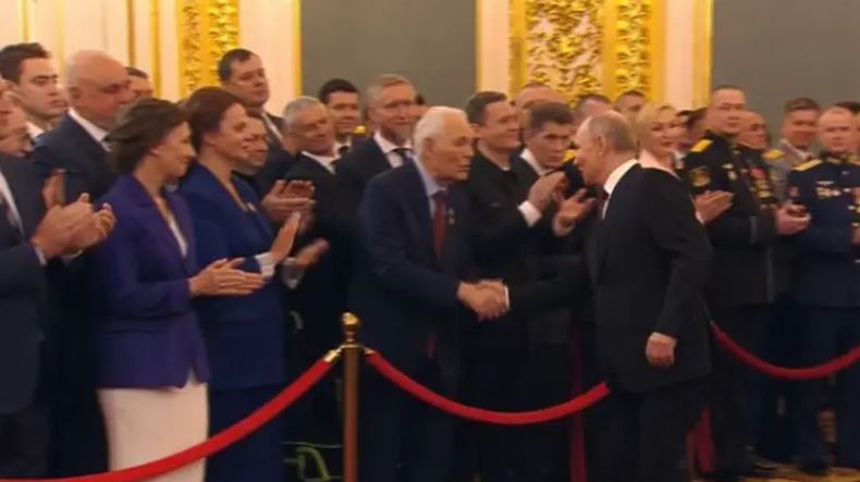 ويظهر الفيديو قيام الرئيس الروسي بالتوقف ومصافحة رجل من بين الحضور بالإضافة إلى امرأة كانا يقفان على يمين ويسار مسار