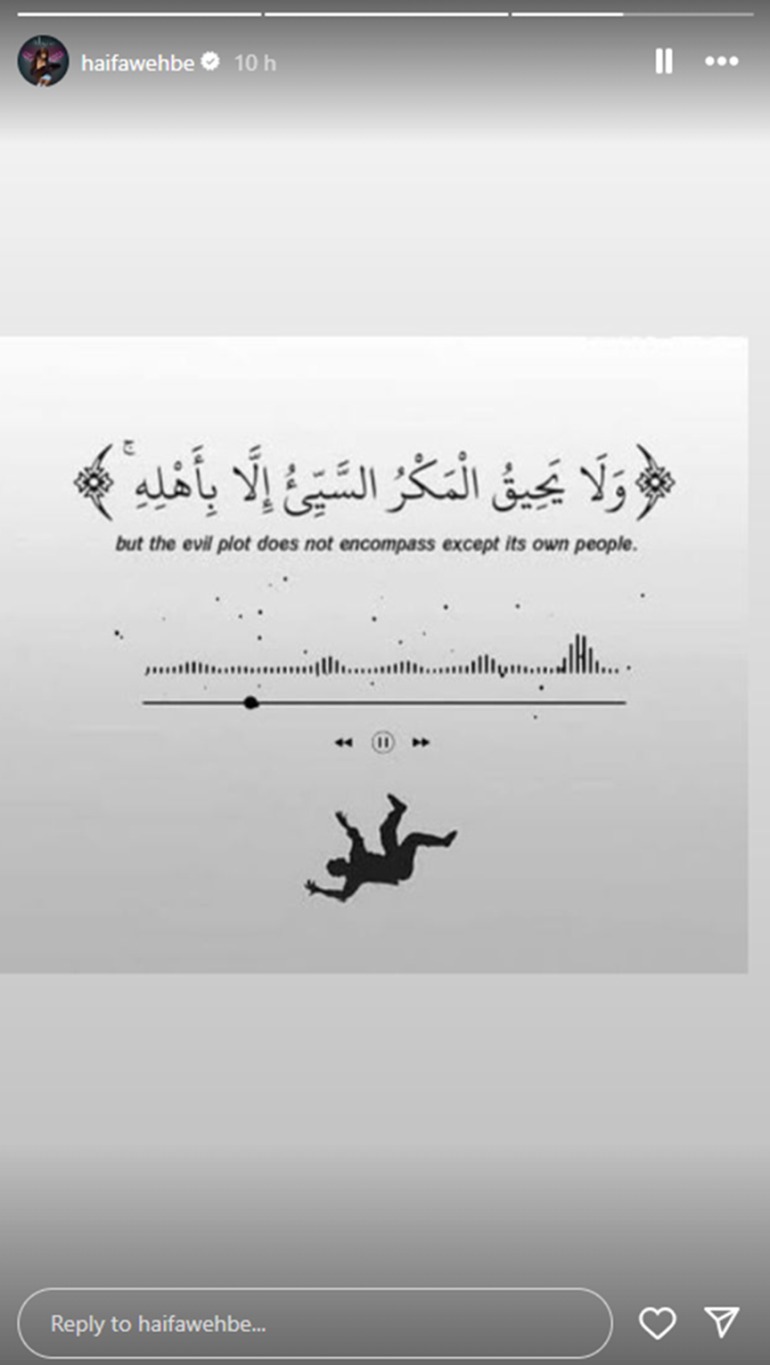 وفي التفاصيل، نشرت هيفاء عبر حسابها الرسمي في تطبيق "إنستغرام"، الآية 43 من سورة "فاطر": "ولا يحيق المكر السيئ إلا بأهله".