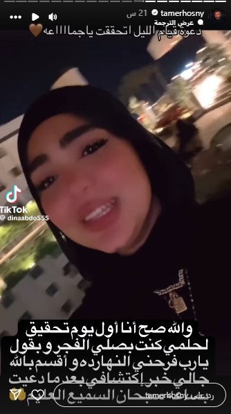 كشف الفنان المصري تامر حسني عن أن أول أحلامه في عالم الفن تحققت بعد دعائه في صلاة الفجر، وذلك بعد مشاركته عبر "ستوري" صفحته الشخصية في "انستغرام" رسالة إحدى معجباته التي كشفت عن حلمها الذي تحقق بسبب دعوة قالتها خلال صلاة قيام الليل.