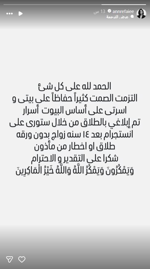 وفي أول تعليق لها، كشفت آن الرفاعي عن صدمتها من طريقة علمها بالخبر، مؤكدة أنها لم تتلق أي إخطار رسمي أو ورقة طلاق من المأذون، وكتبت: "البيوت أسرار، والتزمت الصمت حفاظاً على