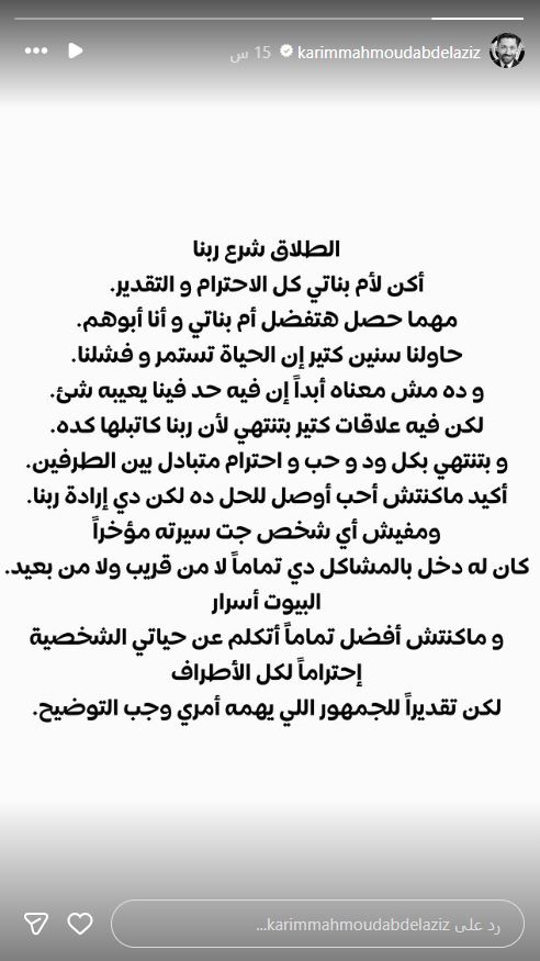 كريم محمود عبد العزيز بياناً على حسابه قائلاً: "الطلاق شرع ربنا، أكنّ لأم بناتي كل الاحترام والتقدير. حاولنا سنين كتير إن الحياة تستمر وفشلنا، وده مش معناه أبداً إن فيه حد يعيبه شيء." وأضاف: "مافيش أي شخص جت سيرته مؤخراً كان له دخل بالمشاكل دي، لا من قريب ولا من بعيد… البيوت أسرار، واحترمت كل الأطراف لكن وجب التوضيح للجمهور."
