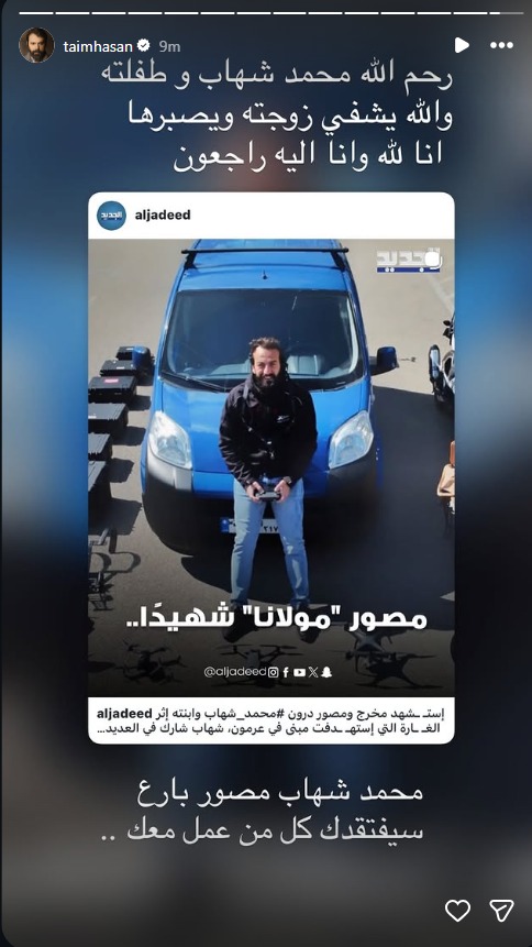 “رحم الله محمد شهاب وطفلته، والله يشفي زوجته ويصبرها… إنا لله وإنا إليه راجعون”، مضيفاً أن محمد شهاب كان “مصوراً بارعاً سيفتقده كل من عمل معه”.