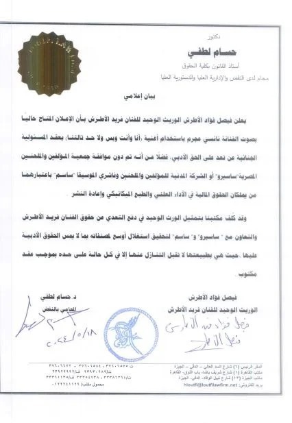 وأضاف البيان: "كلف مكتبنا بتمثيل الوريث الوحيد في دفع التعدي عن حقوق الفنان فريد الأطرش والتعاون مع "ساسيرو" و"ساسم" لتحقيق استغلال أوسع لمصنفاته بما لا يمس الحقوق الأدبية عليها، حيث إنها بطبيعتها لا تقبل التنازل عنها إلا في كل حالة على حدة بموجب عقد مكتوب".