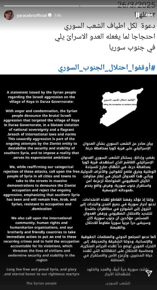 يارا صبري البيان عبر خاصية الستوري على حسابها عبر انستغرام، وارفقته بالتعليق التالي: "26/اذار/2025، 12 ظهرا، دعوة لكل أطياف الشعب السوري، احتجاجا لما يفعله