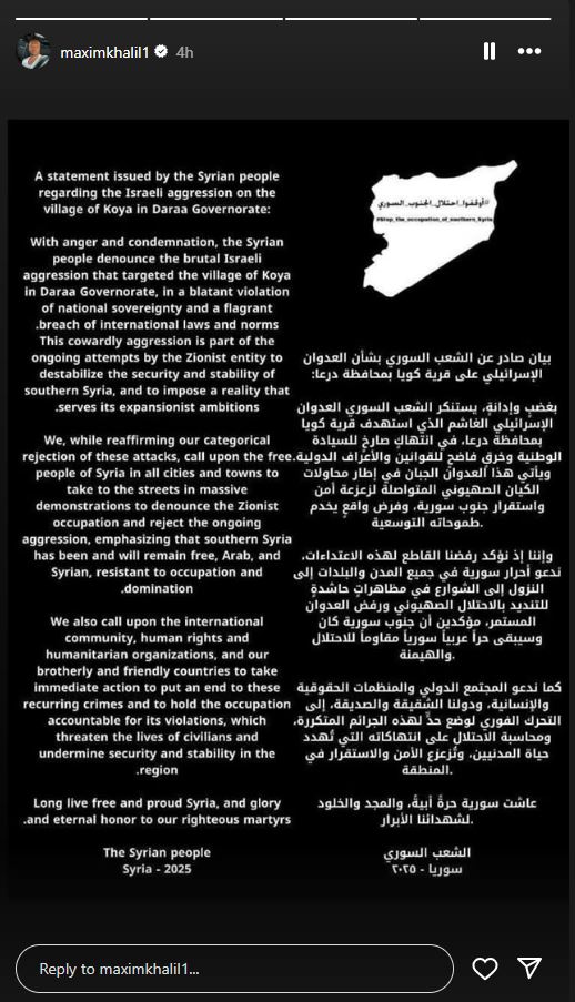 وفي التفاصيل، شارك مكسيم وسوسن عبر خاصية القصص القصيرة على حساباتهما على انستغرام، بيانا جاء فيه: "بيان صادر عن الشعب السوري بشأن العدوان الإسرائيلي على قرية كويا بمحافظة درعا: بغضب وإدانة، يستنكر الشعب السوري العدوان الإسرائيلي الغاشم الذي استهدف قرية كويا بمحافظة درعا، في انتهاك صارخ للسيادة الوطنية وخرق فاضح للقوانين والأعراف الدولية".