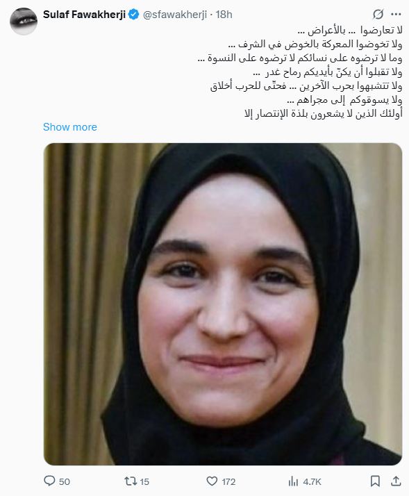 وتابعت: "حاربوا بشرف.. بعفة.. انتقدوا بحجة أنتم تملكونها بقوة.. وبرجولة قوتها في عطفها وتهذيبها.. وإن شتمونا.. لا تشتموهن.. ترفعوا كما كنتم.. وكما أنتم.. فصاحب