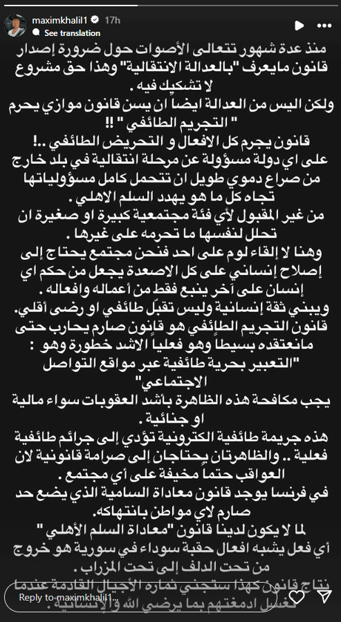وفي التفاصيل، شارك الممثل السوري مكسيم خليل "ستوري" مطولة عبر صفحته الشخصية في "انستغرام"، طالب من خلالها قانون يجرم التجاوزات التي تضر بالسلم الأهلي.