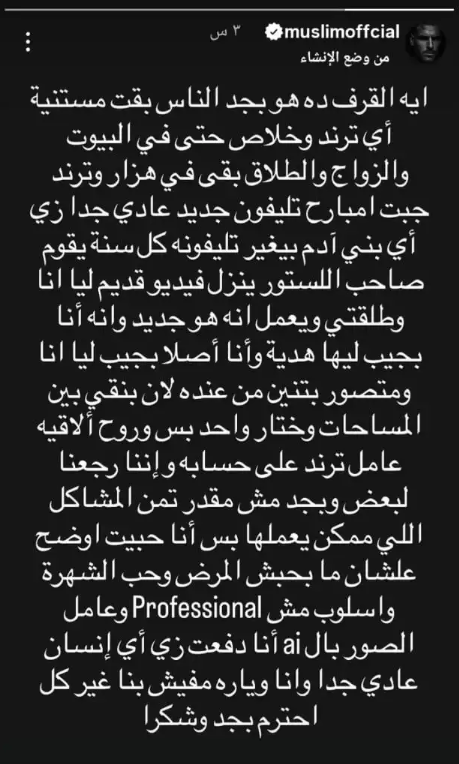 أمام الجدل المتصاعد، خرج مسلم عن صمته ليوضح الحقيقة عبر خاصية “الستوري” في حسابه على إنستغرام قائلاً: "إيه القرف ده؟ هو بجد الناس بقت مستنية أي ترند وخلاص؟ حتى في البيوت والزواج والطلاق بقى في هزار وترند!"، معبّراً عن استيائه من تداول أخبار غير دقيقة تمس حياته الشخصية.