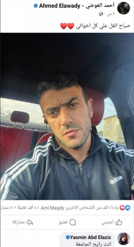 اللافت كان تعليق زوجة احمد العوضي، الممثلة المصرية ياسمين عبد العزيز، التي تركت تعليقا على الصورة قالت فيه: "انت رايح الجامعة"، ليرد عليها العوضي قائلا: "يا اسطا أنت بتتنمري".