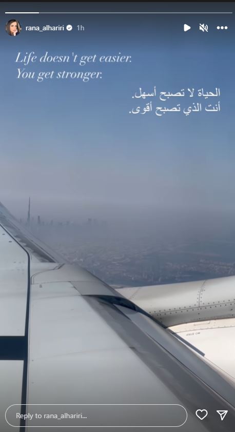 كما نشرت رنا على حسابها عبر انستغرام، مستخدمة خاصية القصص المصورة، مقطع فيديو صورته من الطائرة و كتبت في تعليق عليه: "الحياة لا تصبح اسهل، انت تصبح اقوى."