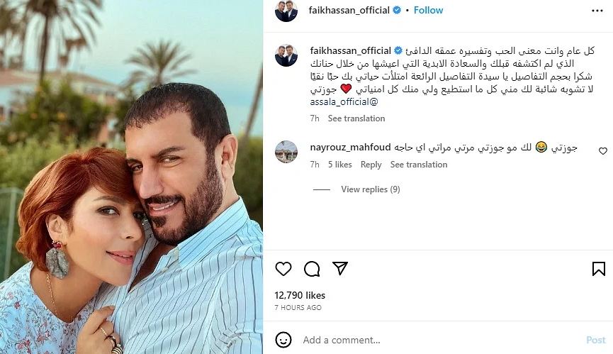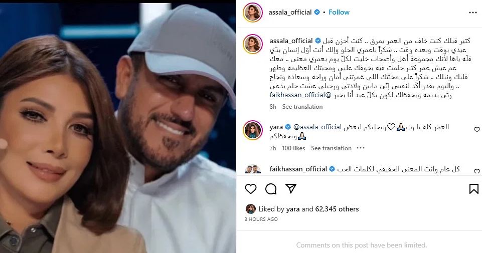 بدورها، غازلت أصالة زوجها وأعربت عن حبها الكبير له في عيد ميلادها، حيث نشرت صورة تجمعها به، وعلقت عليها قائلة: "كتير قبلك كنت خاف من العمر يمرق.. كنت أحزن قبل عيدي بوقت وبعده وقت.. شكرًا ياعمري الحلو وإلك أنت أوّل إنسان بدّي قلّه ياها لأنك مجموعة أهل وأصحاب خليت لكلّ يوم بعمري معنى".