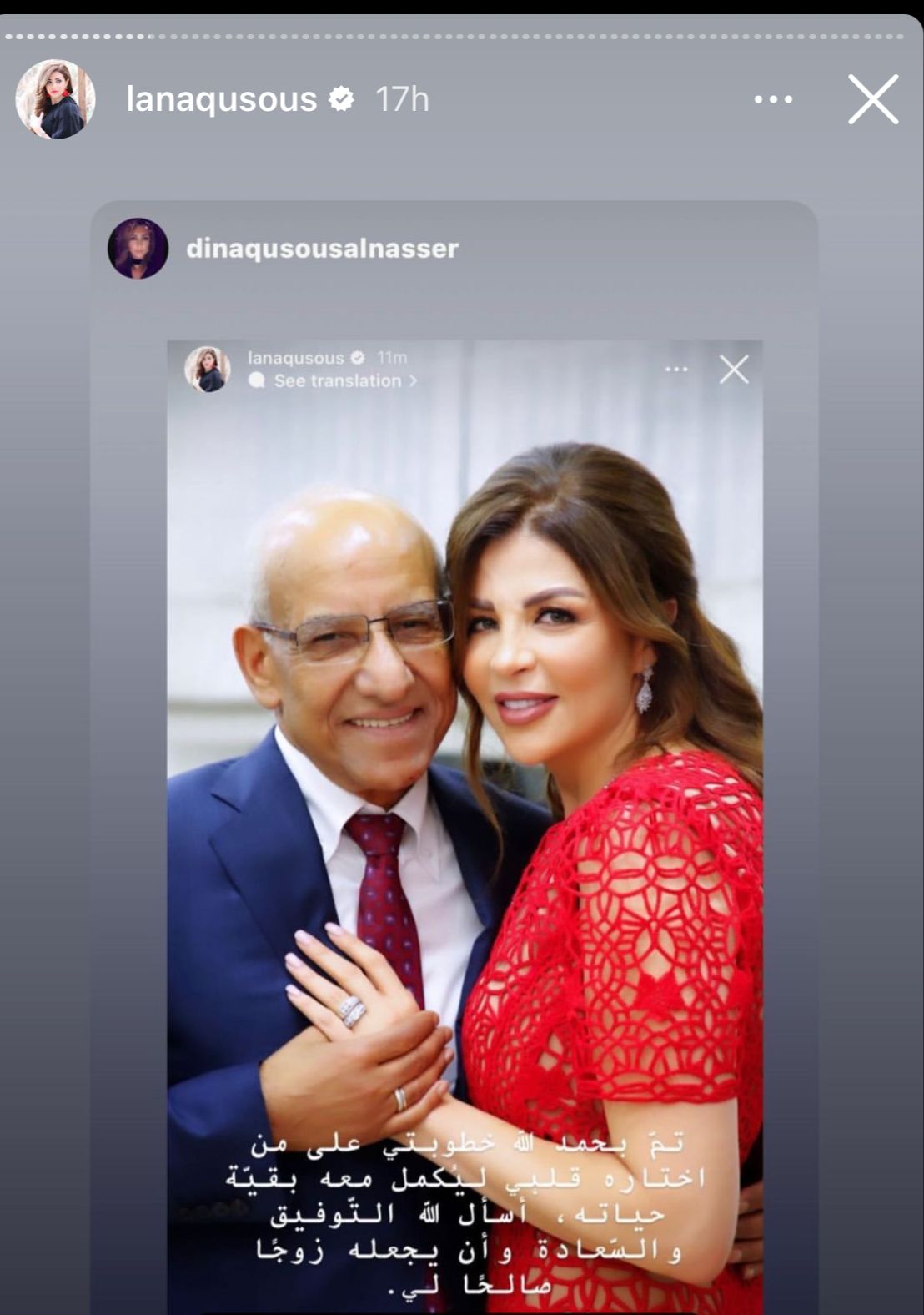 وفي التفاصيل، وثقت لانا القسوس خطوبتها بمجموعة صور نشرتها عبر حساباتها الشخصية على مواقع التواصل الاجتماعي، ليشاركها الجمهور فرحتها.