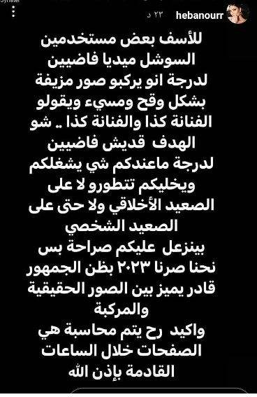 واضافت هبة نور مؤكدة أن الجمهور بات اليوم قادرا على التمييز بين الصور الحقيقية والمزيفة، متوعدة بمقاضاة الصفحات التي تداولت الصور حيث كتبت: "أكيد رح يتم محاسبة هي الصفحات بالساعات القليلة القادمة".