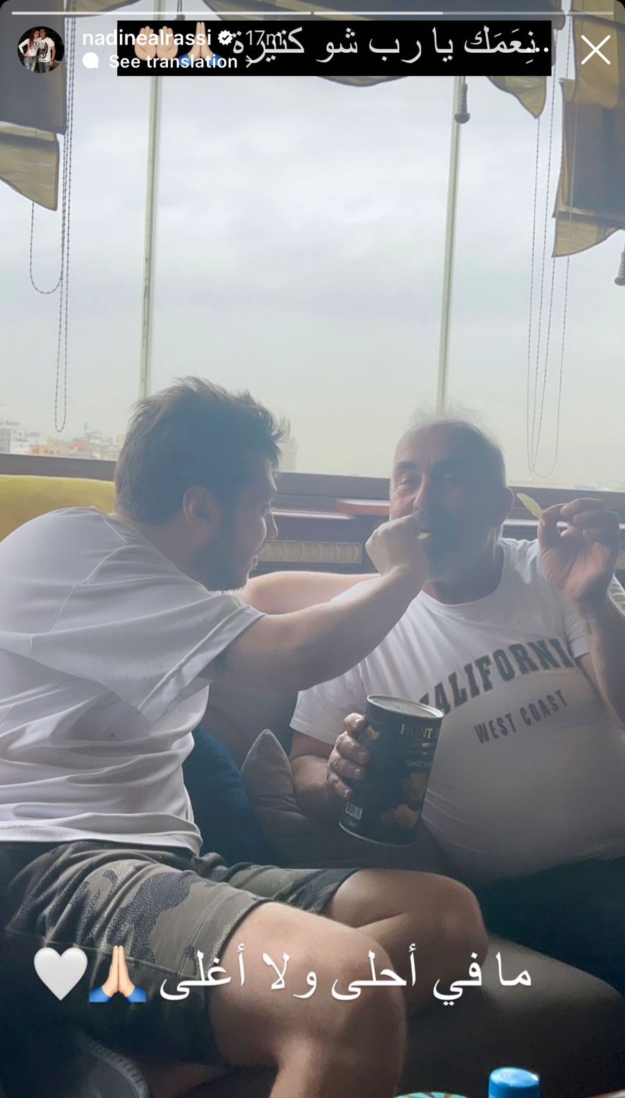 نشرت الفنانة اللبنانية نادين الراسي صورة توثق لحظة اطعام ابنها لوالدها، وعلقت بالقول كاتبة: "نعمك يا رب شو كتيرة، ما في أحلى ولا أغلى".