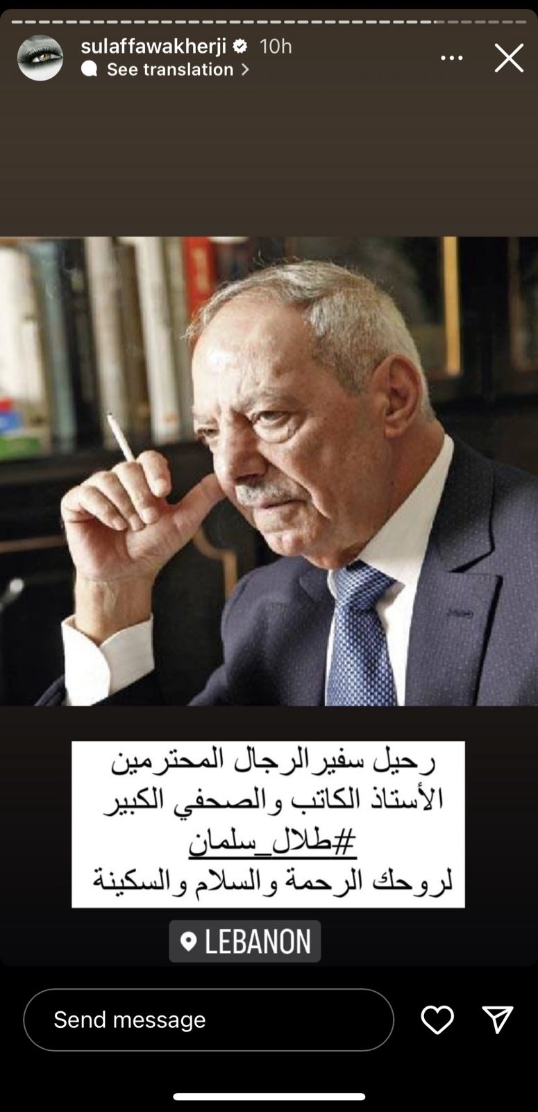 وفي هذا السياق، نعت الفنانة السورية سلف فواخرجي الراحل طلال سلمان، ونؤت عبر خاصية القصص القصيرة على حسابها عبر انستغرام صوة للرتحل، وكتبت: "رحيل سفير الرجال المحترمين الأستاذ الكاتب والصحغي الكبير طلال سلمان".