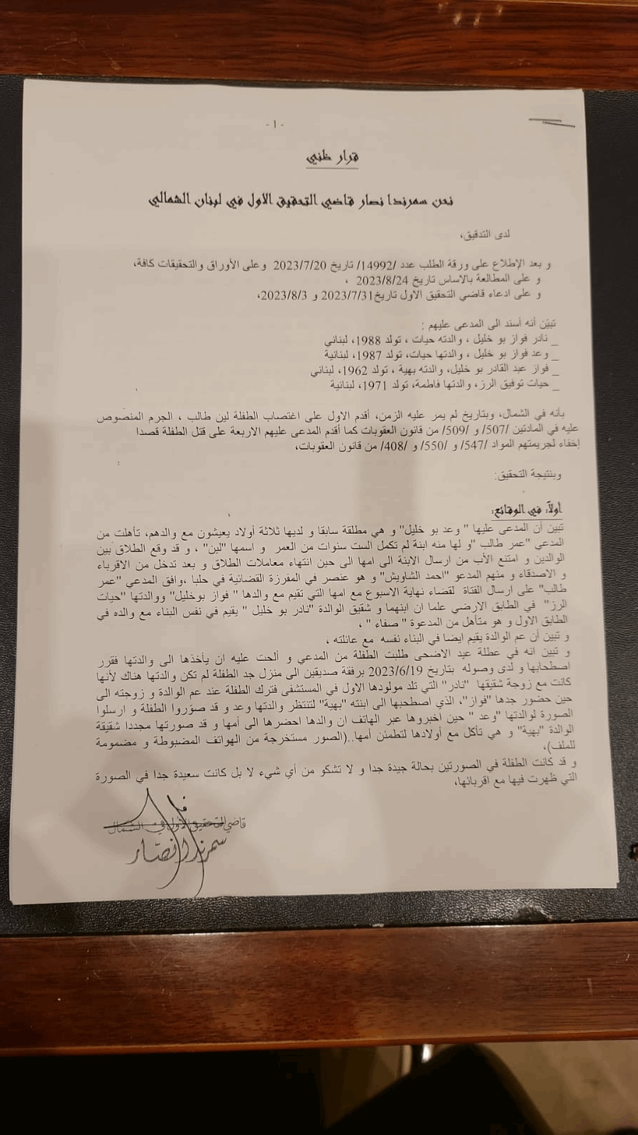 والجديد في الامر هو التطور القضائي الذي حصل، اذ أصدرت قاضية التحقيق الأولى في الشمال سمرندا نصار، قرارها الظني حيث اعتُبِر فعل خالها ينطبق على جنايتي المادتين 503 و504 في قانون العقوبات، كما اعتبرت أنّ وفاة لين ينطبق على انهاء الحياة عمداً وفق المادة 549 من هذا القانون، حيث طلبت القاضية نصار محاكمة الخال ووالدتها وجدها وجدتها لأمها بهذه الجناية التي تنصّ على عقوبة الإعدام.