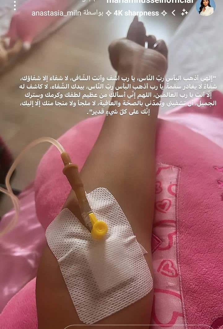 وفي التفاصيل، نشرت مريم عبر خاصية القصص القصيرة على حسابها عبر "إنستغرام" صورة ليدِها، أظهرت تلقيها تغذية وريدية داخل منزلها، وعلقت: "إلهي أذهب الباس رب الناس.. اشفِ وأنت الشافي".