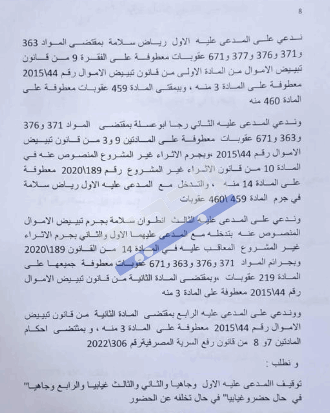 وأشارت مصادر لـ الجديد بأن من بين المدعى عليهم: حاكم مصرف لبنان السابق رياض سلامة، ورجا أبو عسلة، أنطوان سلامة، ورئيس مجلس إدارة أحد أكبر المصارف اللبنانية. كما شمل الادعاء مجموعة رئيس الحكومة السابق نجيب ميقاتي وشقيقه طه ميقاتي وتم تحويل الملف إلى قاضي التحقيق الأول.
