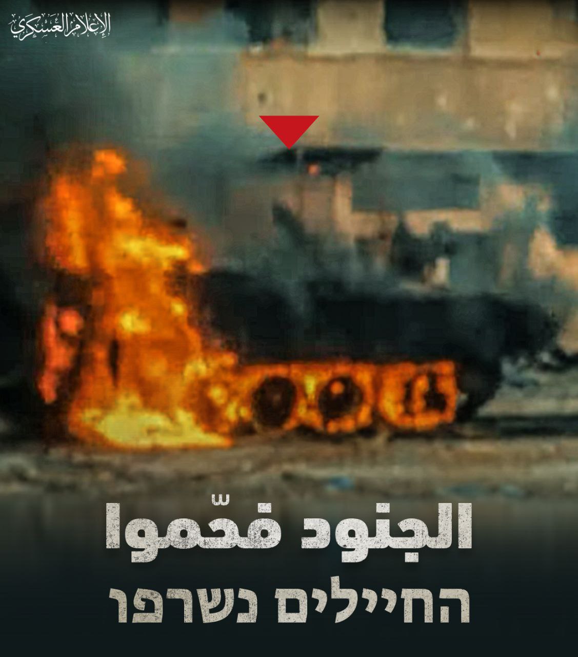 نشرت كتائب القسام الجناح العسكري لحركة حماس تصميماً تحت عنوان "الجنود فحّموا"، وكُتبت العبارة بالعبرية أيضاً لإيصال رسالة إلى العدو الإسرائيلي رفقة صورة دبابته التى تحترق إثر إستهدافها من قبل مقاتلي القسام عن قرب.