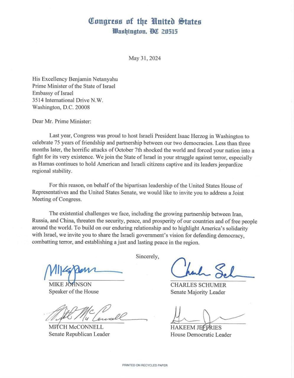 جاء في الرسالة: "إننا ننضم إلى إسرائيل في كفاحكم ضد الإرهاب". "لهذا السبب، وبالنيابة عن قيادة الحزبين في مجلس النواب الأمريكي ومجلس الشيوخ الأمريكي، نود أن ندعوكم لإلقاء كلمة أمام اجتماع مشترك للكونجرس."