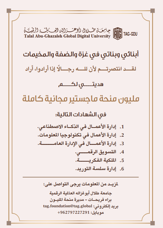 أعلنت جامعة طلال أبوغزاله العالمية الرقمية عن تقديم مليون منحة ماجستير مجانية كاملة للفلسطينيين من ابناء غزة والضفة الغربية والمخيمات .