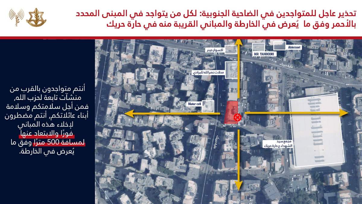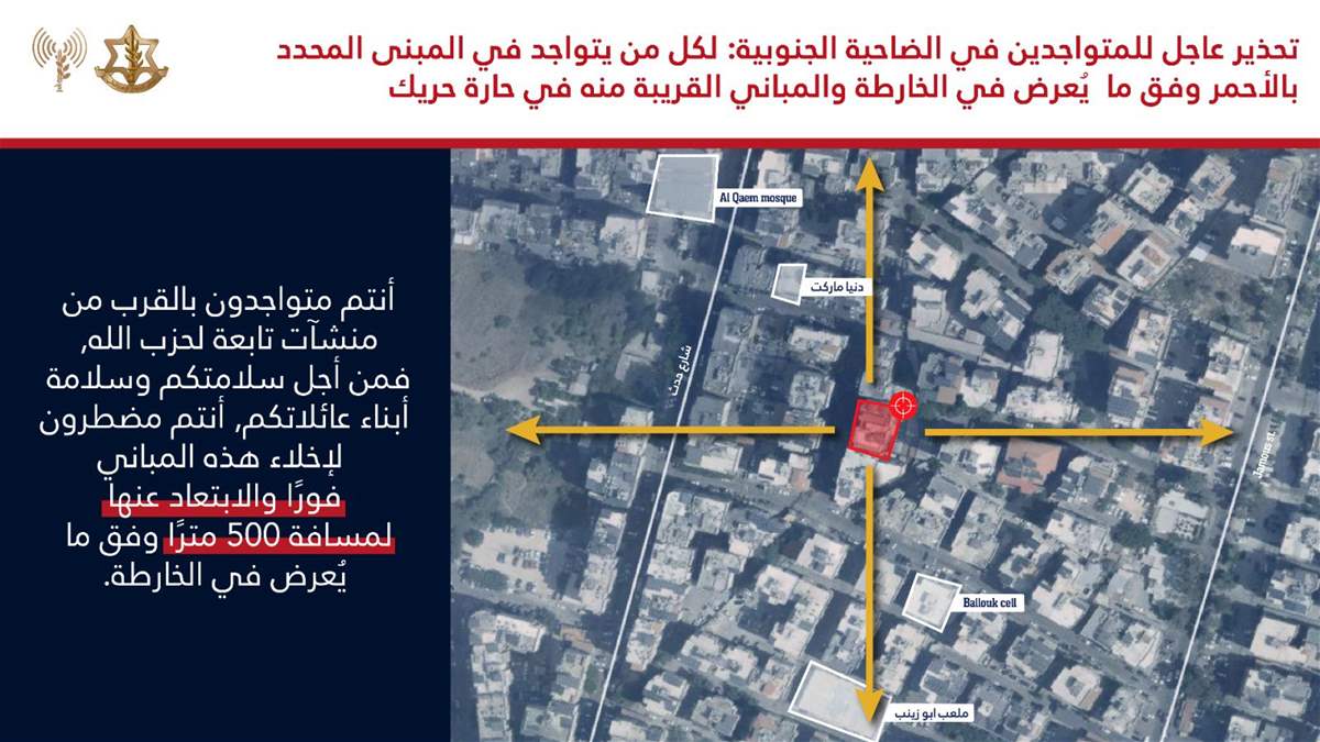 بالصور - جيش العدو ينذر سكان مناطق في حارة حريك بالإخلاء