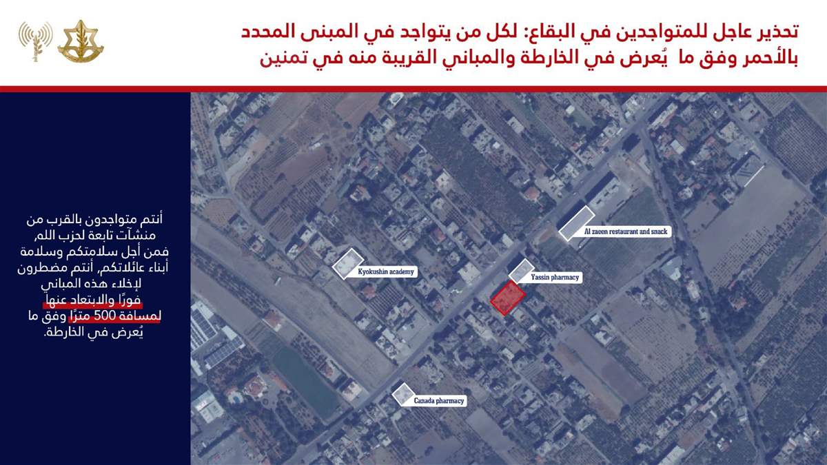 نشر جيش العدو تهديداً بالإخلاء إلى سكان منطقة البقاع وتحديداً المتواجدين في المبنى المحدد في الخارطة والواقع في منطقة تمنين.