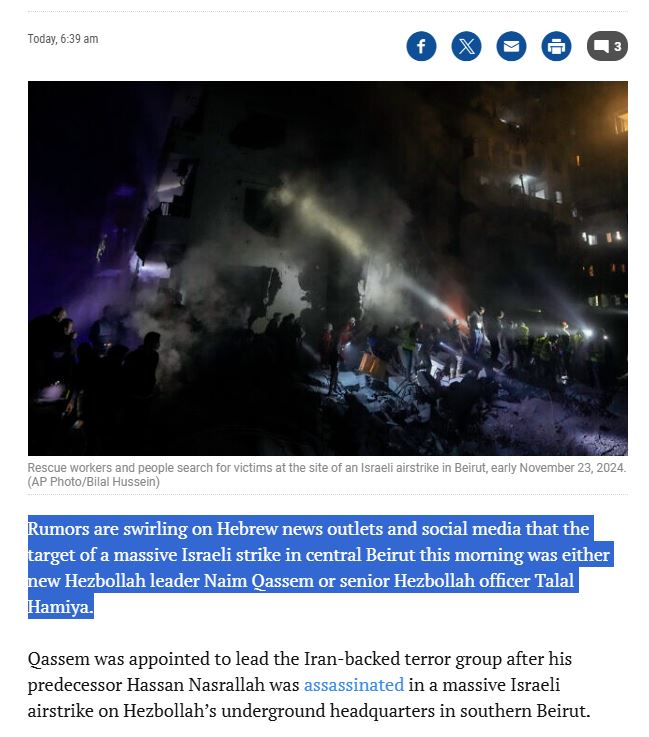 بعدما نقلت في وقت سابق عن "تقارير عبرية" ان المستهدف بغارة البسطة هو القيادي في "حزب الله" طلال حمية، صحيفة "تايمز او اسرائيل" تعدل خبرها وتقول انها "شائعات" عبر مواقع التواصل والاعلام العبري.