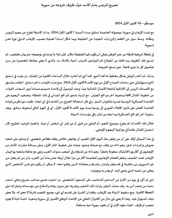 نشرت قناة الرئاسة السورية على "تيليغرام" بياناً قيل أنه صدر عن بشار الأسد من موسكو بتاريخ 16 كانون الأول، جاء فيه: "مع تمدد الإرهاب في سوريا، ووصوله العاصمة دمشق مساء السبت، بدأت الأسئلة تطرح عن مصير الرئيس ومكانه، وسط سبل من اللغط والروايات البعيدة عن الحقيقة، بما شكل إسناداًٍ لعملية تنصيب الإرهاب الدولي ثورة تحرر لسوريا".