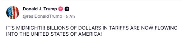 وكتب ترامب على منصته تروث سوشال مع انقضاء مهلة السابع من آب التي حددها لبدء فرض هذه الرسوم: "انه منتصف الليل (بالتوقيت المحلي). مليارات الدولارات جراء التعرفات تتدفق الآن الى الولايات المتحدة الأميركية".