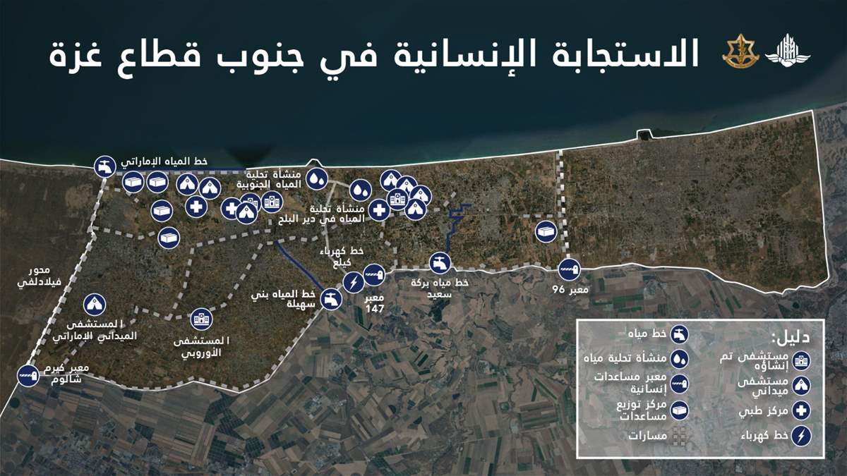 ادرعي: "تضم المنطقة الانسانية بنى تحتية إنسانية حيوية مثل مستشفيات ميدانية وخطوط مياه ومرافق تحلية مياه إلى جانب توفير متواصل لمواد غذائية وخيم وأدوية ومواد طبية التي سيتم ادخالها بتنسيق بين وحدة تنسيق أعمال الحكومة في المناطق والمجتمع الدولي".
