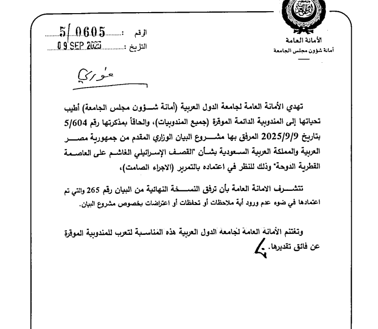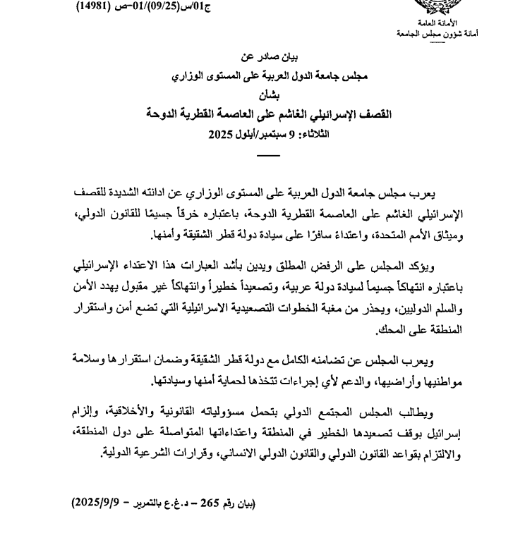 جامعة الدول العربية تدين القصف الإسرائيلي على الدوحة