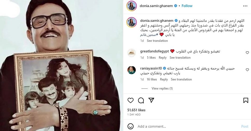 إنستغرام"، صورة لوالدها ظهر فيها وهو يحتضن "إطارا" توجد فيه صورته رفقة زوجته الفنانة الراحلة دلال عبدالعزيز وابنتيه، وارفقت دنيا الصورة بالتعليق التالي: "اللهم ارحم من فقدنا بقدر ما تمنينا لهم البقاء وبقدر الفراغ الذي بات في صدورنا منذ رحيلهم".