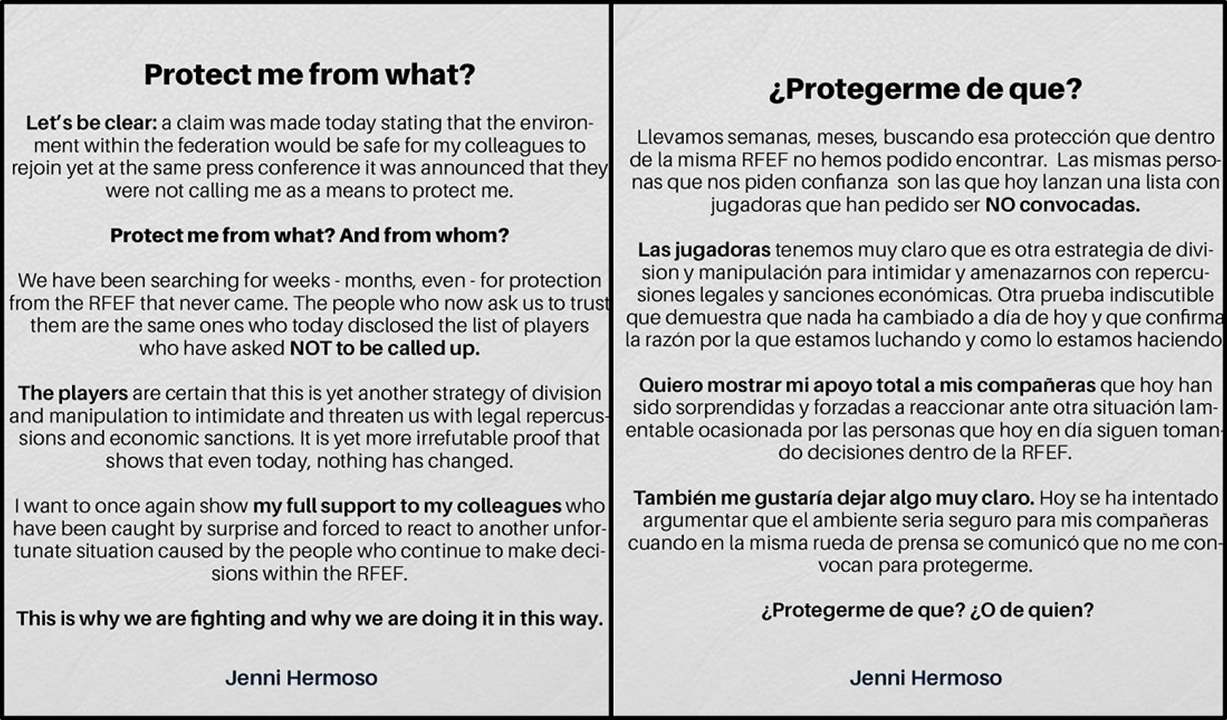 وردّت لاعبات المنتخب الإسباني عبر بيان على قرار استدعائهن للمنتخب وأوضحن "سوف ندرس العواقب القانونية بعدما وضعنا الاتحاد ضمن قائمة طالبنا بعدم التواجد فيها لأسباب تم شرحها علانية، نحن نشعر بالحزن من الوضع الذي أُرغمنا على التواجد فيه مرة أخرى".