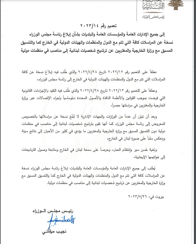 أصدرت رئاسة مجلس الوزراء تعميماً إلى جميع الإدارات والمؤسسات العامة والبلديات بشأن إبلاغها نسخة عن المراسلات كافّة التي تتم مع الدول والمنظّمات والهيئات الدولية في الخارج.