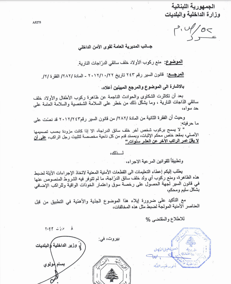 وجه وزير الداخلية والبلديات في حكومة تصريف الأعمال القاضي بسام مولوي كتابا إلى المديرية العامة لقوى الأمن الداخلي، طلب فيه "منع ركوب الأولاد خلف سائقي الدراجات النارية".