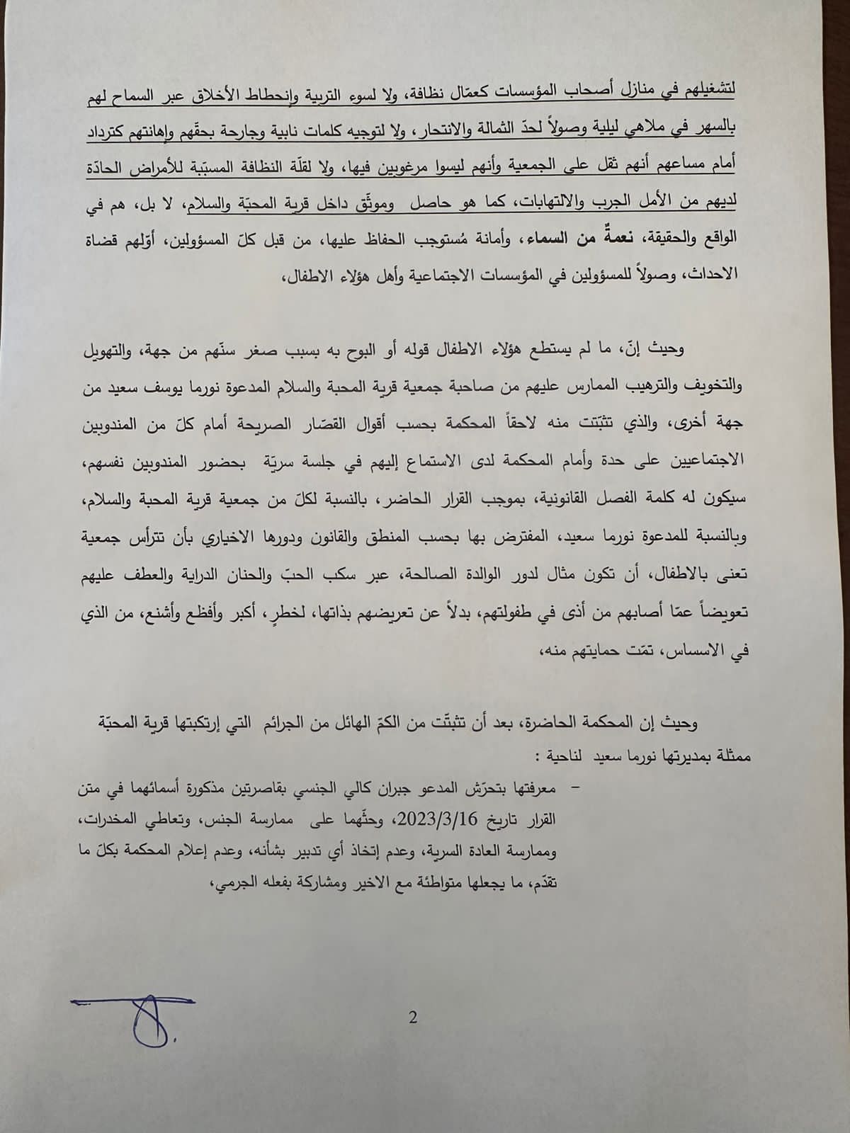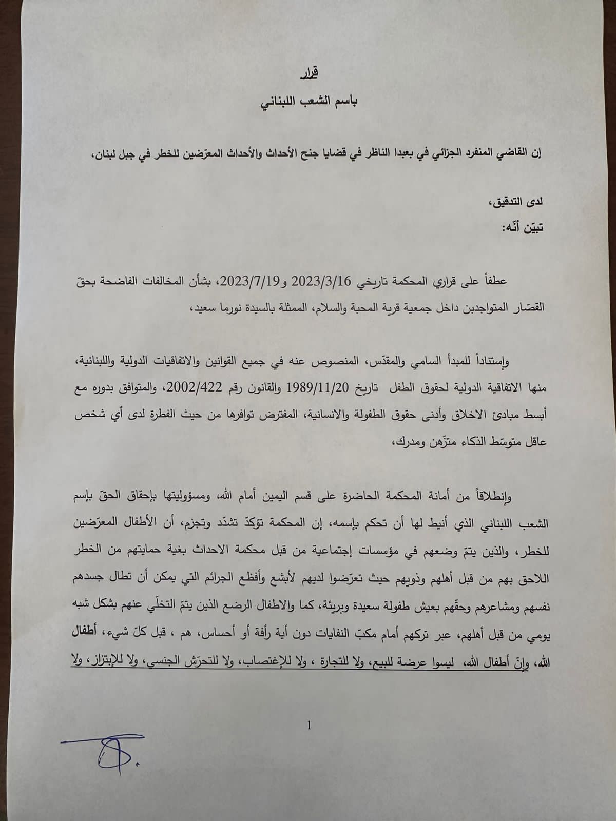 قررت "إقفال جمعية قرية المحبة والسلام بشكل فوري وحالي، وختمها بالشمع الأحمر، بشأن المخالفات الفاضحة بحق القصّار الموجودين داخل الجمعية، وإحالة القرار الراهن الى جانب المحامي العام الاستئنافي في جبل لبنان القاضي سامر ليشع، لينفَّذ أصولاً من قبل مديرية التحقيق المركزي وفقاً لمصمون إشارته."