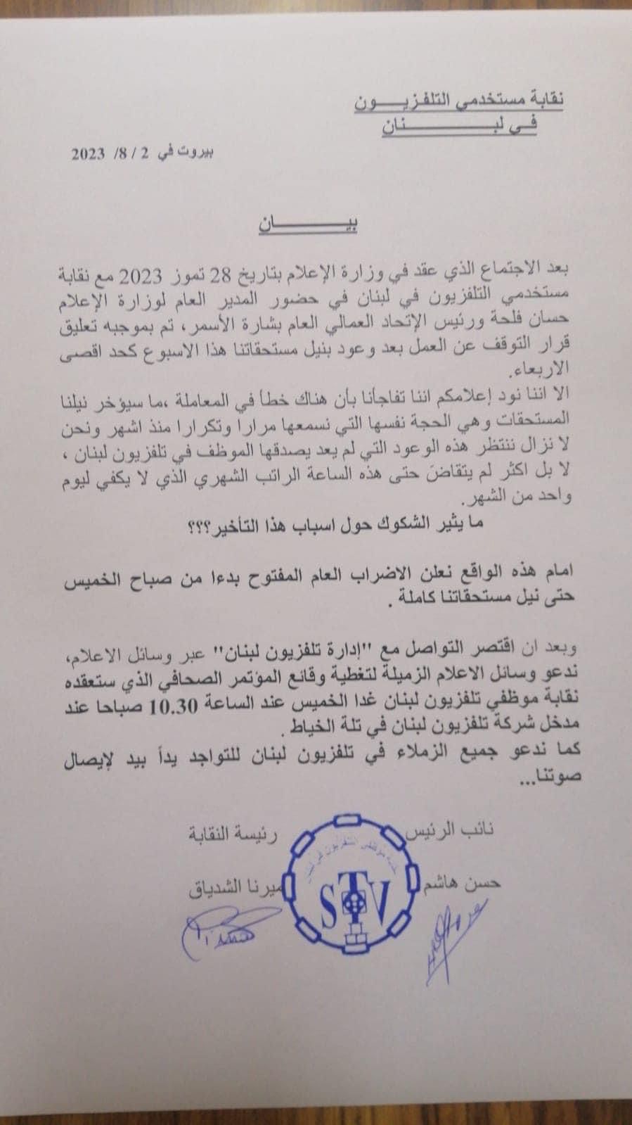 أصدرت ادارة تلفزيون لبنان بياناً جاء فيه: "بعد الاجتماع الذي عُقد في وزارة الاعلام بتاريخ 28 تموز 2023 مع نقابة مستخدمي شركة تلفزيون لبنان، في حضور رئيس الاتحاد العمالي العام بشارة الأسمر، والذي تمّ بموجبه تعليق قرار الاضراب بعد الجهود التي بذلها وزير الاعلام، وأفضت الى الاستحصال على قرار من وزير المالية بنقل اعتماد من احتياطي الموازنة العامة الى موازنة وزارة الاعلام_ تلفزيون لبنان بقيمة 17 مليار ليرة لبنانية لدفع المستحقات للمستخدمين منذ شهر تشرين الثاني 2021 ولغاية اواخر ايار 2023".