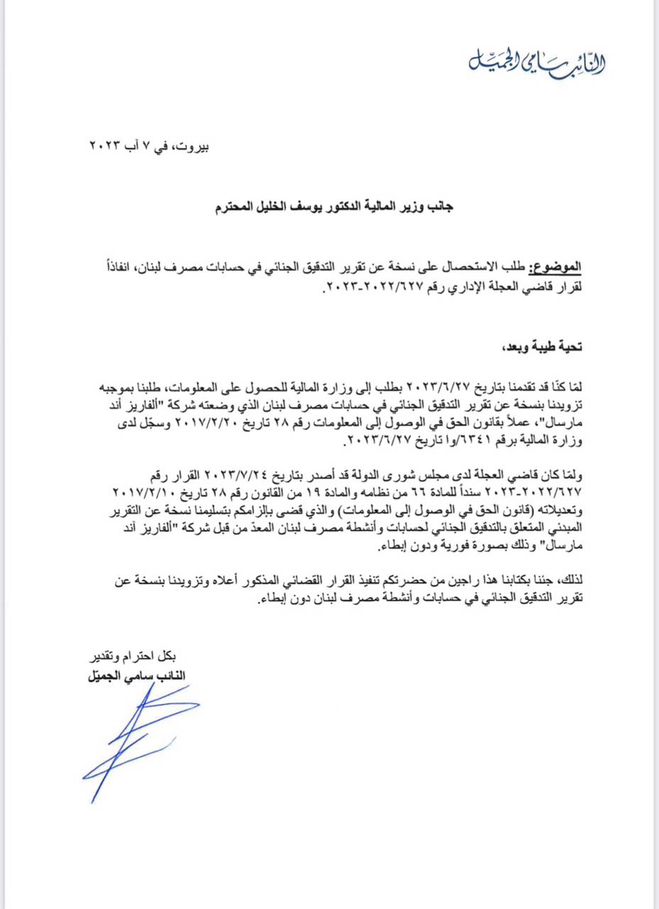وكان الجميّل قد تقدّم بتاريخ ٢٧/٦/٢٠٢٣ بطلب إلى وزارة المالية للحصول على المعلومات، طالباً تزويده بنسخة عن تقرير التدقيق الجنائي عملاً بقانون الحق في الوصول إلى المعلومات رقم ٢٨ تاريخ ٢٠/٢/٢٠١٧.