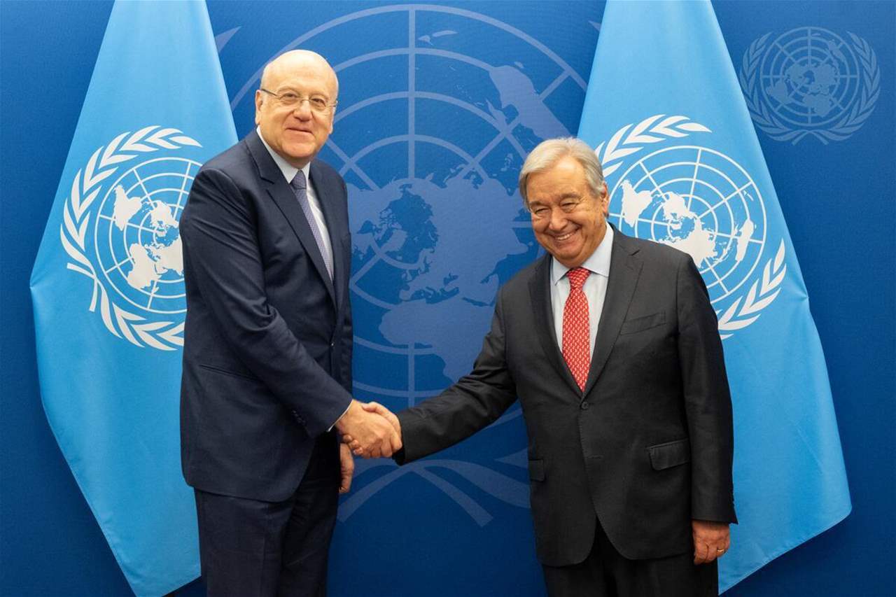 بدوره شكر رئيس الحكومة الامم المتحدة "على دعمها للبنان على الصعد كافة". وشكر السيد غوتيريس "على دعمه الموقف اللبناني خلال عملية التجديد لولاية اليونيفيل". وجدد" تأكيد التزام لبنان القرارات الدولية"، ودعا" الامم المتحدة الى دعم لبنان لوقف الانتهاكات الاسرائيلية لسيادته". وأعرب" عن قلق لبنان من ارتفاع اعداد النازحين السوريين، ومن عدم قدرته على تحمل المزيد خصوصا في ظل الازمة الاقتصادية والمالية الحادة التي يعاني منها".