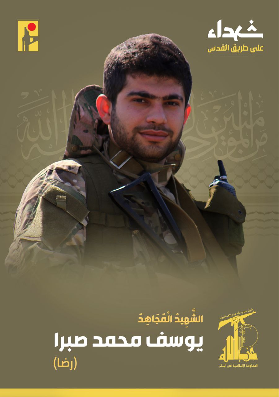أصدر حزب الله البيان التالي: "بمزيد من الفخر والإعتزاز، تزف المقاومة الإسلامية الشهيد المجاهد يوسف محمد صبرا "رضا" من بلدة حداثا في جنوب لبنان، والذي ارتقى شهيداً على طريق القدس".