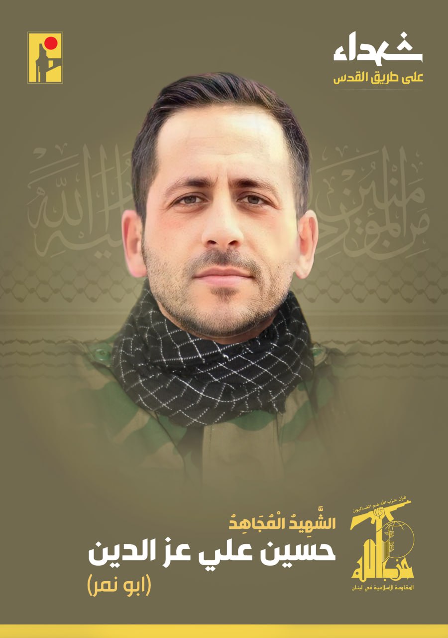 صدر عن حزب الله البيان الآتي: "بمزيد من الفخر والإعتزاز، تزف المقاومة الإسلامية الشهيد المجاهد حسين علي عزالدين "أبو نمر" من بلدة معروب في جنوب لبنان، والذي ارتقى شهيداً على طريق القدس".