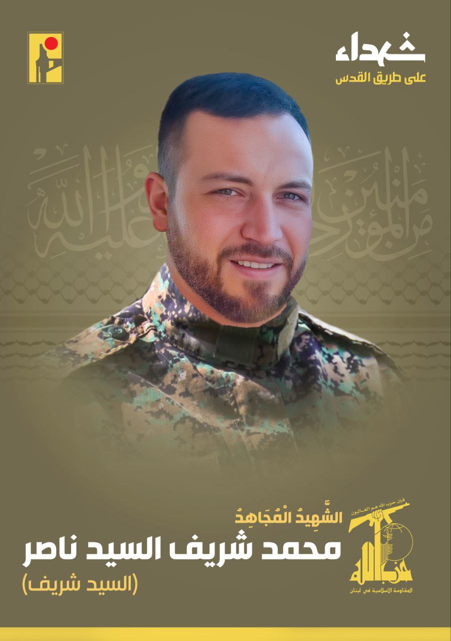 "بمزيد من الفخر والإعتزاز، تزف المقاومة الإسلامية الشهيد المجاهد محمد شريف السيد ناصر "السيد شريف" من بلدة حي الفيكاني في البقاع، والذي ارتقى شهيداً على طريق القدس".