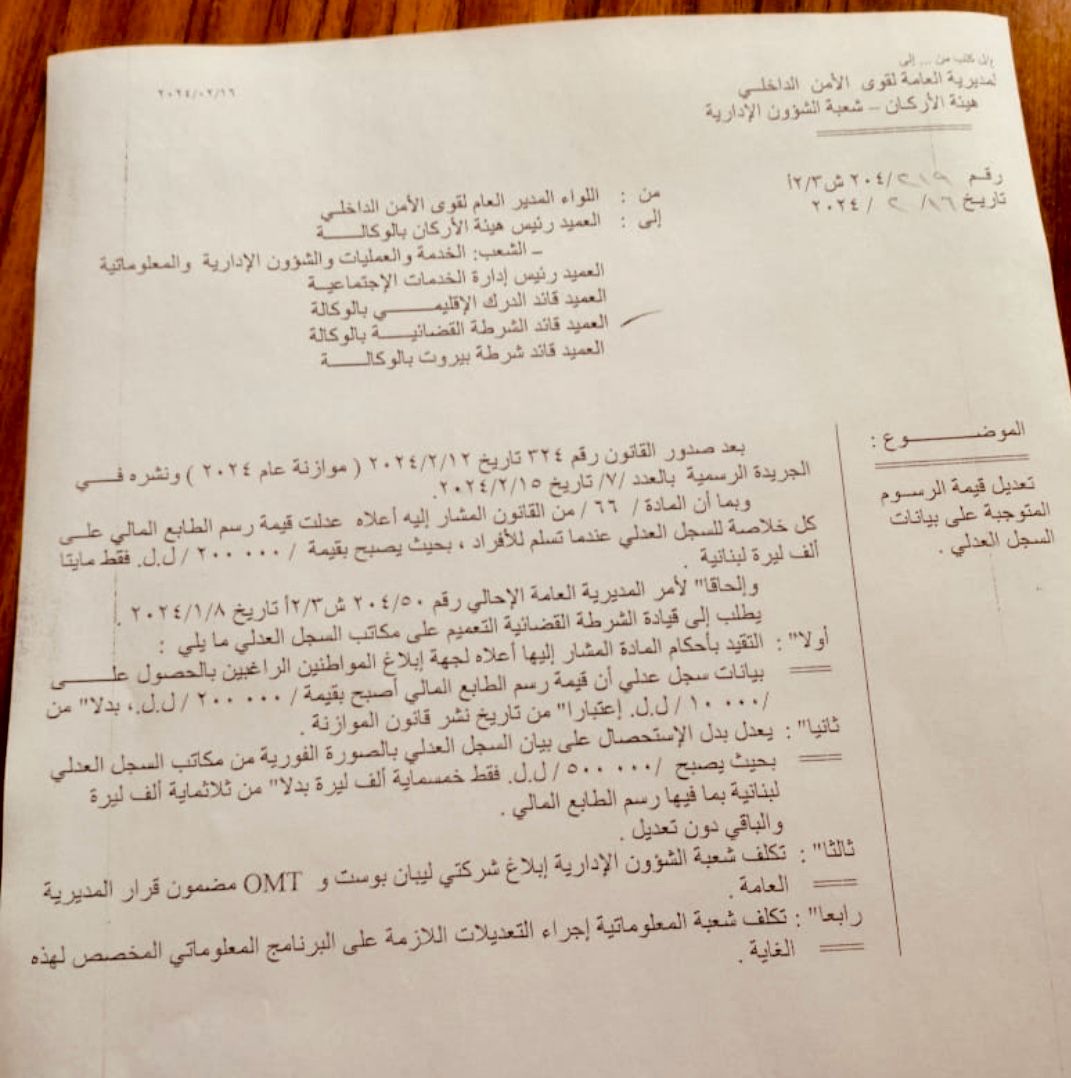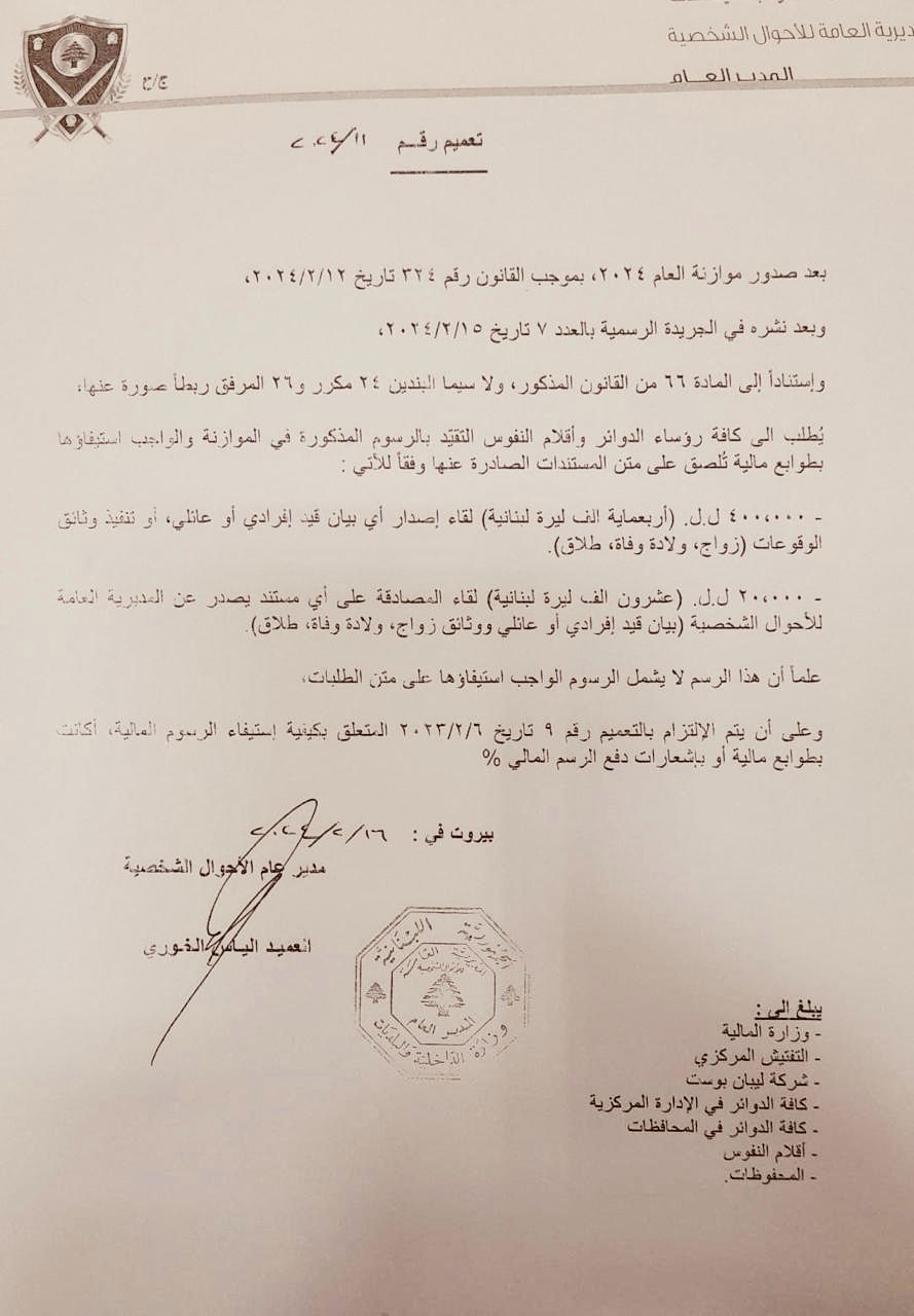 أعلنت المديرية العامة للأحوال الشخصية قائمة تظهر الزيادات الجديدة على كلفة السجل العدلي وإخراج القيد.