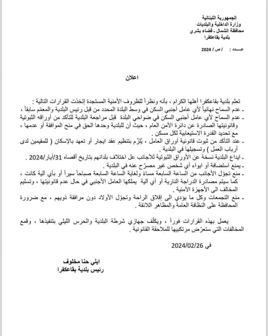 على ضوء التطورات الأمنية.. بلدية بقاعكفرا تتخذ سلسلة قرارات تتعلق بالعمال الأجانب
