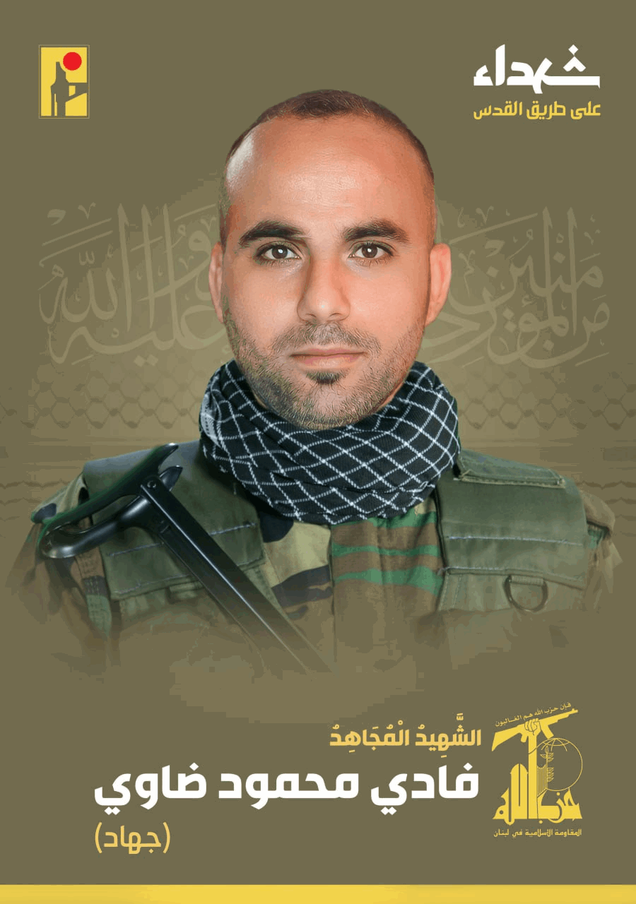 بياناً جاء فيه: "بمزيد من الفخر والإعتزاز، تزف المقاومة الإسلامية الشهيد المجاهد فادي محمود ضاوي "جهاد" مواليد عام 1976 من بلدة
