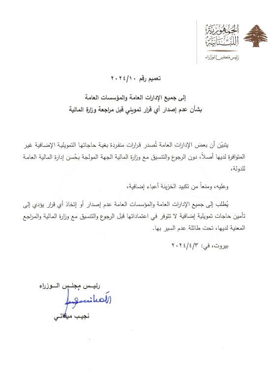 أصدر رئيس الحكومة نجيب ميقاتي قراراً حمل الرقم 10/2024 الى الإدارات والمؤسسات العامة بشأن عدم اصدار اي قرار تمويلي قبل مراجعة وزارة المالية.