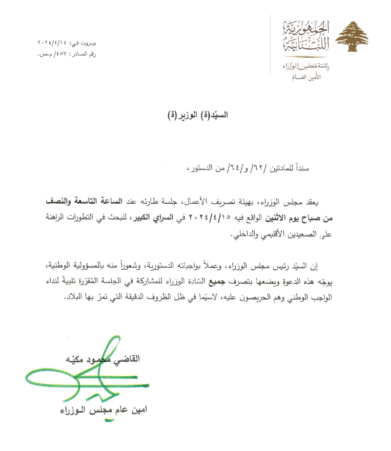 رعا رئيس حكومة تصريف الاعمال الى جلسة طارئة لمجلس الوزراء