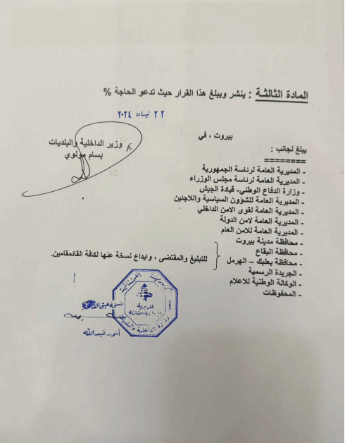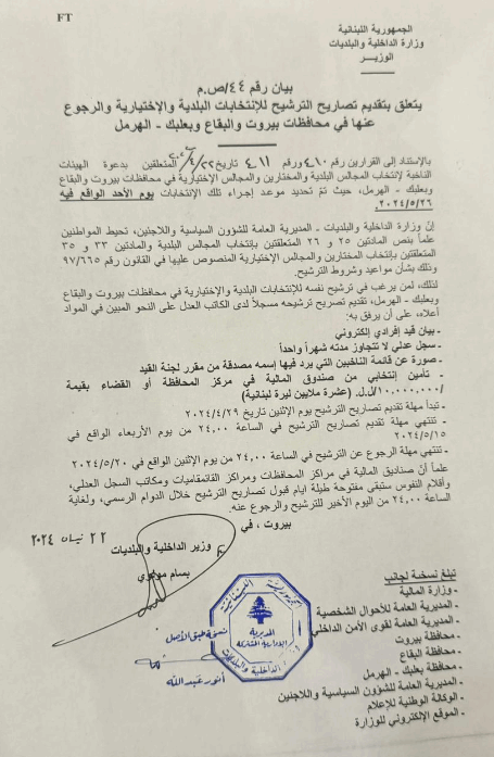 وبعلبك - الهرمل لانتخاب أعضاء المجالس البلدية وتحديد عدد الاعضاء لكل منها، ولانتخاب مختارين ومجالس اختيارية وتحديد عدد المختارين والأعضاء الاختياريين لكل منها في دوائر محافظة بيروت ودوائر محافظتي البقاع وبعلبك - الهرمل، وذلك بتاريخ ٢٦ ايار ٢٠٢٤.