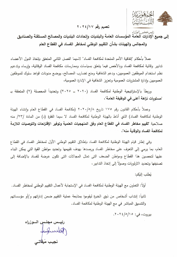 اصدر رئيس حكومة تصريف الاعمال نجيب ميقاتي تعميماً تعلق بالتقييم الوطني لمخاطر الفساد في القطاع العام .. جاء فيه ما يلي: